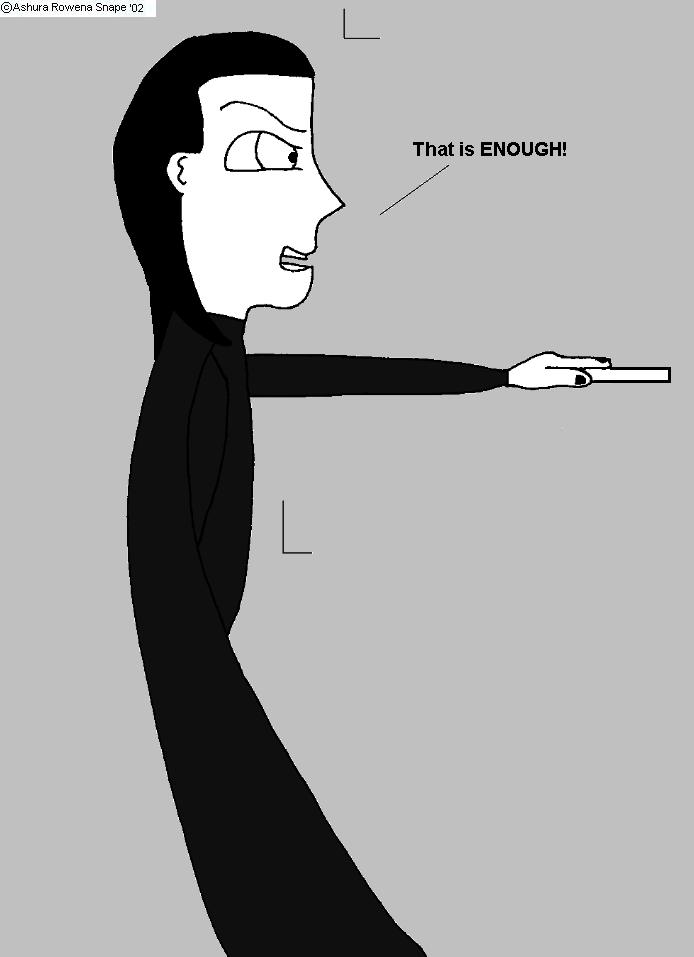 “That is enough!” What is the meaning of this small dialogue? Nothing! I was writing a fan fiction, and he says that, but I quit on it. I didn’t want to write it anymore. And I never got around to taking the quote out….Let’s say, he was about to hex someone, for insulting him. ^_^;;